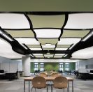 To attain the desired aesthetics and acoustics, the design team selected Armstrong SOUNDSCAPES Shapes acoustical clouds. Designed for use in exposed structures that need spot acoustics, the clouds can be installed as individual units or grouped together.