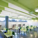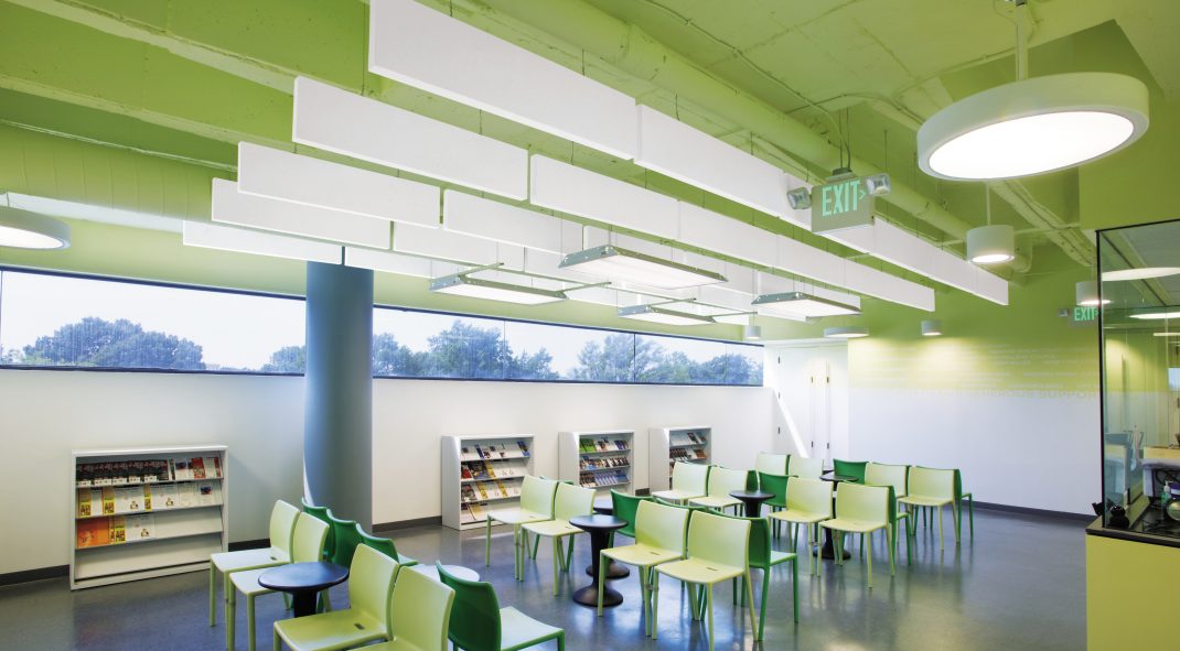 The noise-absorbing properties of the blades were a key factor to their use in the newly renovated space. However, Seltzer notes their horizontal design was also important. “Traditional baffles, which are usually vertical in shape and used in taller spaces, would have cut down on the volume of the room and also blocked much of the light coming through the windows,” he says.