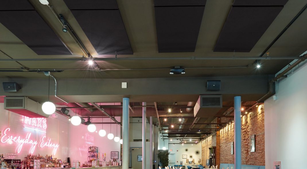 Max’s Eatery is a 2,800-square-foot restaurant with a seating capacity of 128. It is located in a space previously occupied by another restaurant. Soon after owner, Matt Titter, renovated the space and opened, he realized there was a noise problem. “The space is full of hard surfaces, which made it really difficult to have a conversation at a table. Plus, we became known for our milk shakes, and the constant whirr of the milk shake mixers created another layer of noise that added to the problem. We had some real sound struggles.”