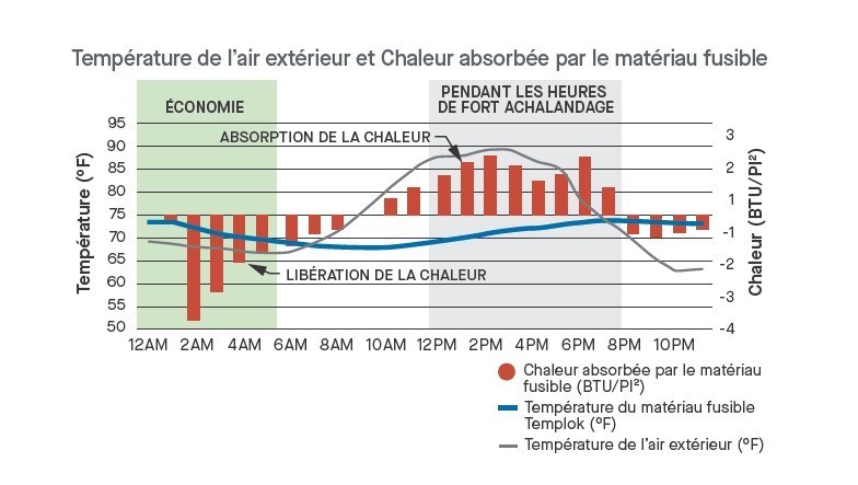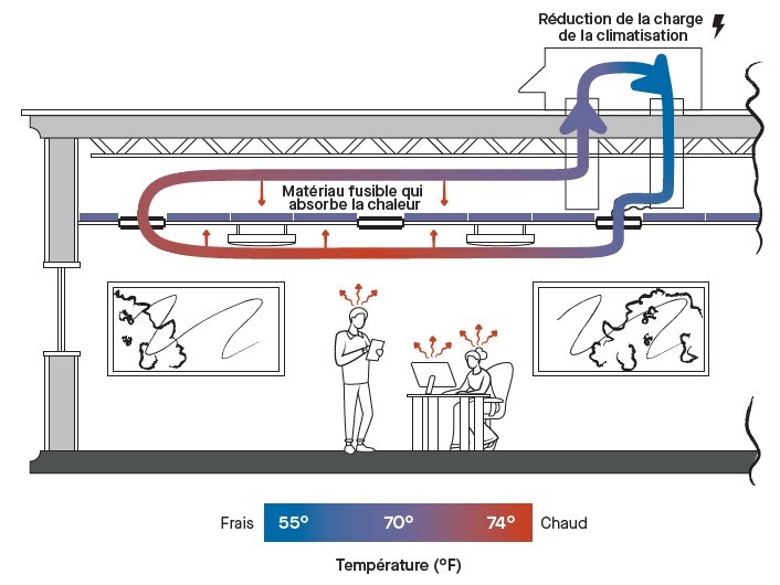 (Fig. 1) Le MCP absorbe la chaleur de l’air, abaissant sa température et réduisant la charge de refroidissement.