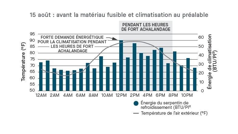 Réduction de la charge de pointe : Dans les figures 4 et 5, l’énergie de refroidissement a été comparée en semaine avec des modèles de température extérieure similaires avant et après la modernisation avec le MCP et le prérefroidissement. Auparavant, la demande de refroidissement de pointe se produisait pendant les heures chaudes de l’après-midi. Après la modernisation, la demande de l’après-midi était nettement inférieure. Le pic a été décalé vers le début de la matinée, lorsque le refroidissement était plus efficace.
