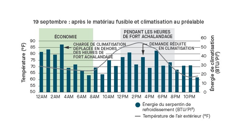 Stratégie de contrôle : Le système de gestion du bâtiment (SGB) a été programmé pour exploiter la masse thermique du MCP. Au petit matin, le thermostat était réglé à 20 °C (68 °F) avec la fonction économiseur activée. Tout au long de la journée, les points de consigne ont été progressivement augmentés jusqu’à 23 °C (74 °F), maintenant le confort thermique tout en permettant au MCP de fondre.
