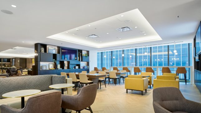 Para aprimorar o conforto dos hóspedes e a clareza da fala no ressonante lobby e lounge do Hotel Marriott Marquis em Nova York, um estudo avaliou soluções de forro acústico. Os resultados revelaram uma redução drástica no tempo de reverberação, criando um ambiente mais silencioso e acolhedor, preservando a estética refinada do espaço.